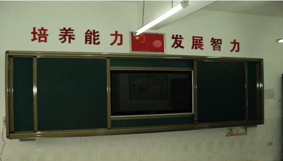 2. 外滑軌裝置:安裝兩塊移動綠板,兩綠板尺寸之和與內(nèi)軌道白板的尺寸一致;進行常規(guī)教學(xué)時,可將此綠板滑動到液晶電視前方,保護液晶觸摸一體機,增大書寫面積;進行多媒體教學(xué)時,將綠板拉開,使用液晶觸摸一體機。